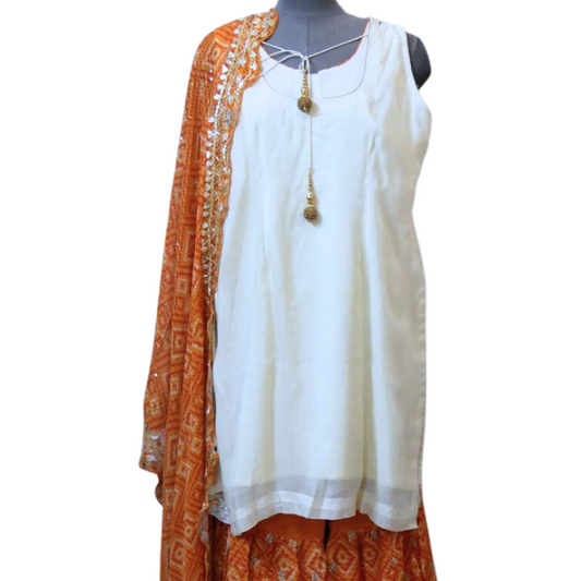 OFF WHITE TISSUE GEORGETTE KURTA WITH ORANGE GEORGETTE BANDHANI GARARA AND CHIFFON DUPATTA