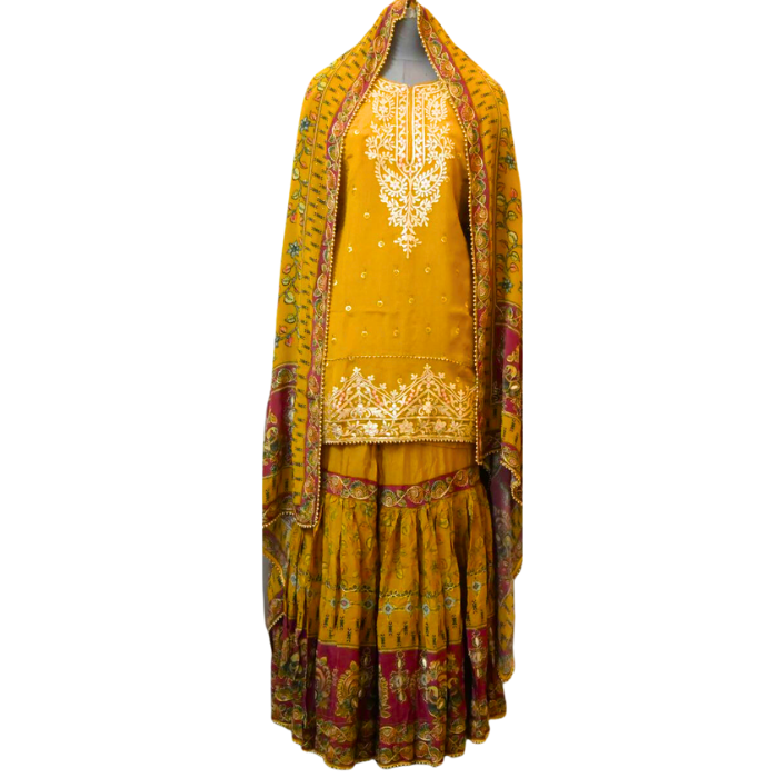 MUSTARD YELLOW CREPE SILK SHARARA WITH FINE GOTA WORK